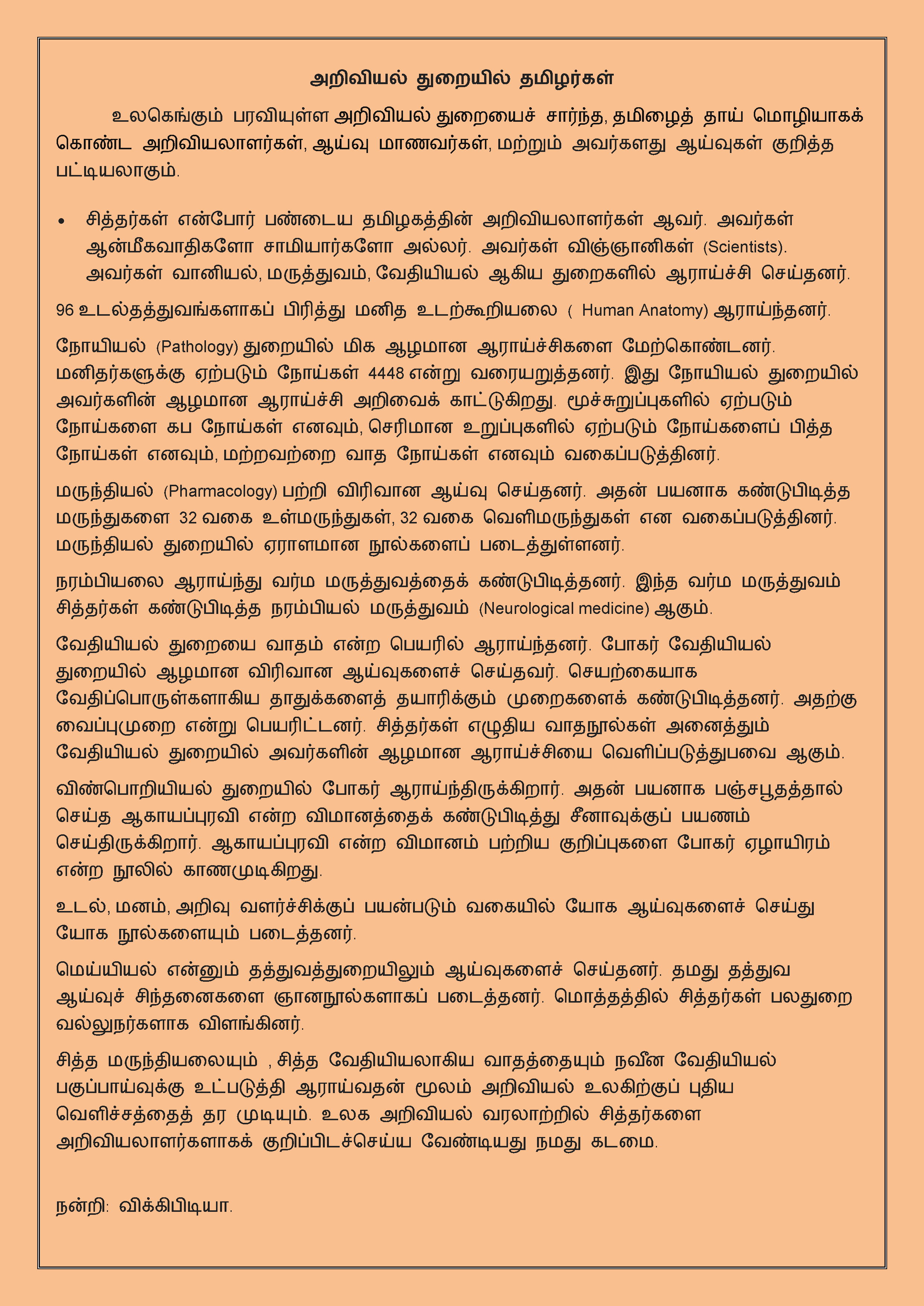• சித்தர்கள் என்போர் பண்டைய தமிழகத்தின் அறிவியலாளர்கள் ஆவர். அவர்கள் ஆன்மீகவாதிகளோ சாமியார்களோ அல்லர். அவர்கள் விஞ்ஞானிகள் (Scientists). அவர்கள் வானியல், மருத்துவம், வேதியியல் ஆகிய துறைகளில் ஆராய்ச்சி செய்தனர்.